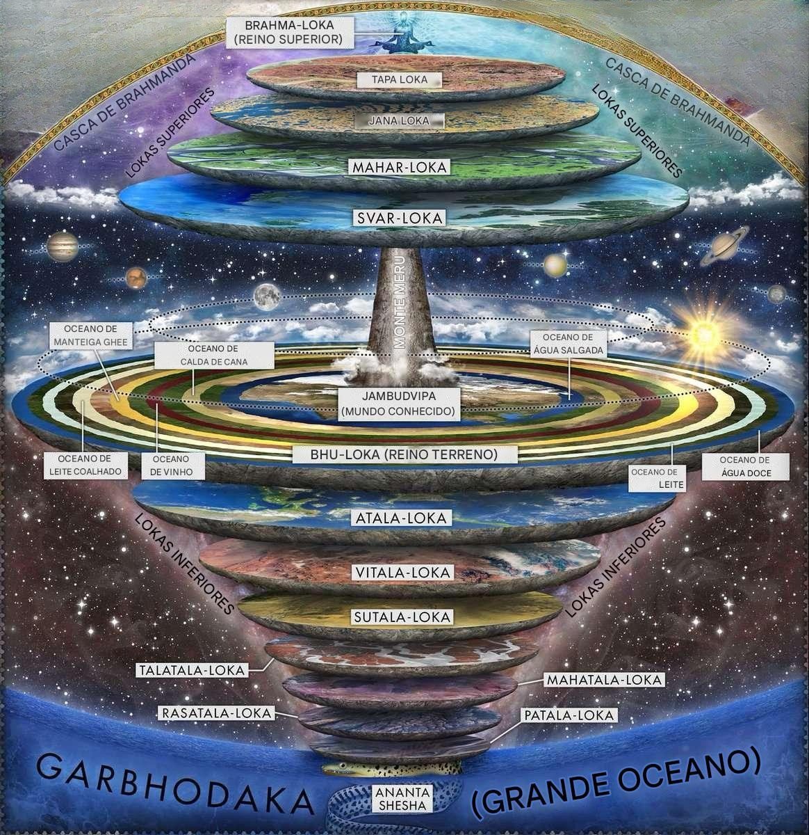 Na Índia antiga, os Vedas e os Puranas apresentam o universo dividido em camadas ou lokas, com ciclos repetitivos de criação, preservação e destruição. O tempo não é linear, mas cíclico, e o mundo funciona dentro de regras rígidas chamadas dharma, que regem tanto a ordem social quanto a ordem cósmica.